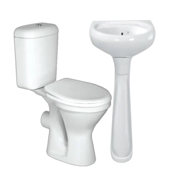 - Includes: Close-coupled toilet pan, cistern, flush mechanism, toilet seat, basin, pedestal.