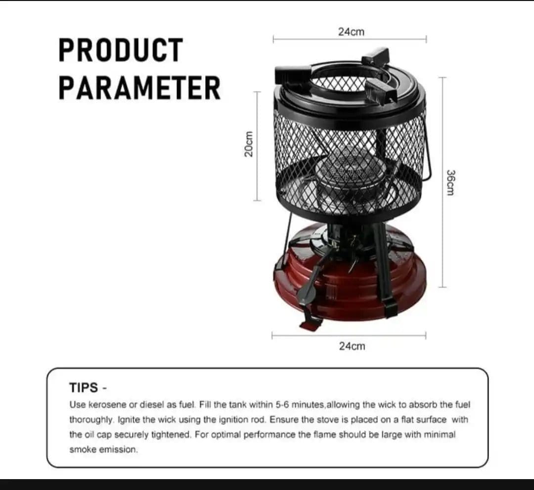 - Dual Function: Works as a paraffin heater and as a stove for boiling, frying, or cooking meals.