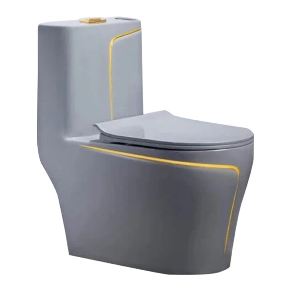 - Bring elegance, comfort, and modern functionality to your bathroom with the Royal Grey Gold Line One-Piece Toilet. Designed with a sleek grey finish accented by golden detailing, this toilet combines luxury aesthetics with durable performance.
